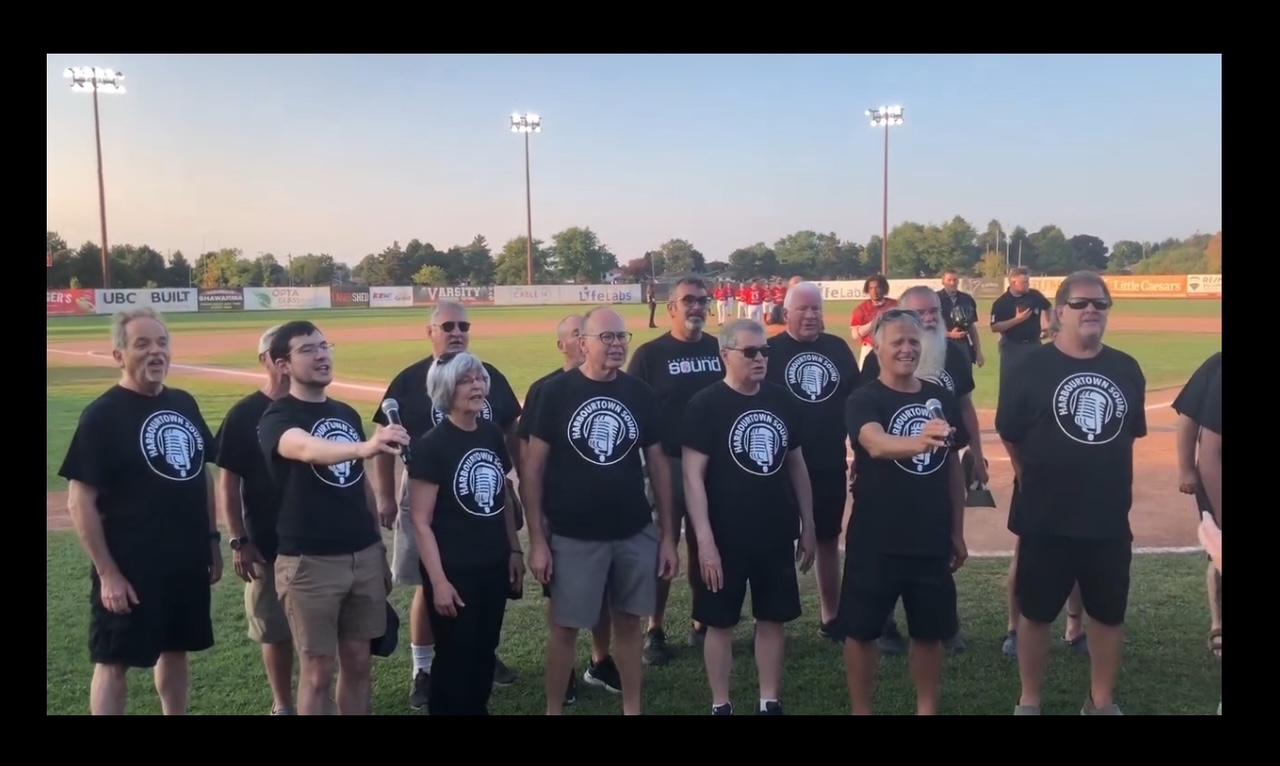 On a warm August evening a group of Harbourtown Sound singers proudly lead the Hamilton Cardinals baseball crowd with O Canada prior to the game. They received rousing ovation, and the Cardinals went on to win the game! (We can't take credit for the win, but hope our rendition of our national anthem set the tone for the enthusiastic support from the crowd.)